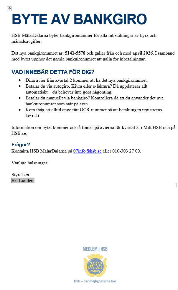 Viktig info gällande Betalning av bostadsavgift och andra månadsavgifter